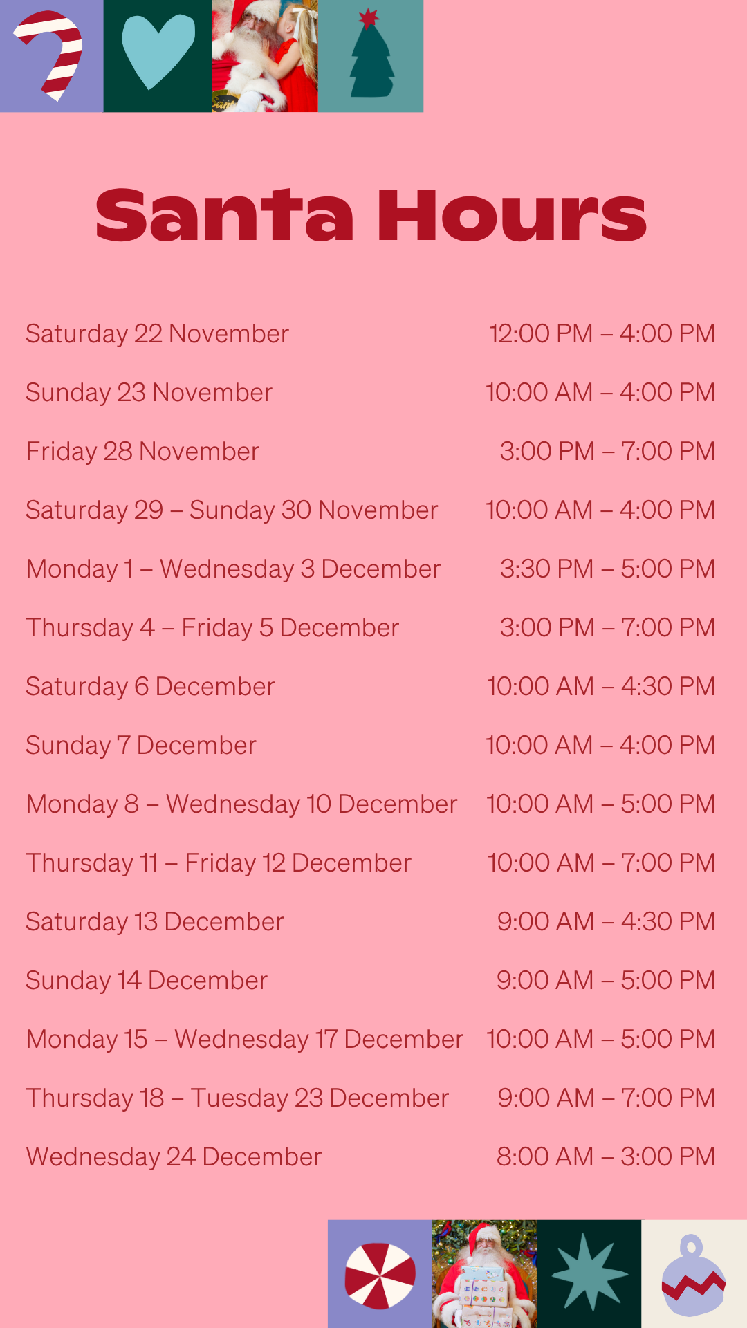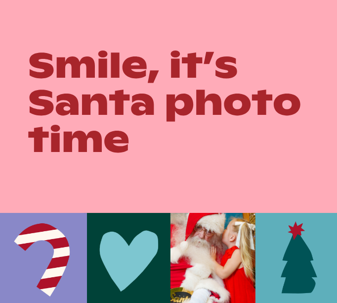 You can visit Santa between (times) or book online to secure your perfect session. Choose from a variety of photo packages to suit your family’s needs.